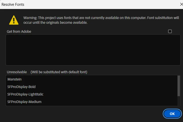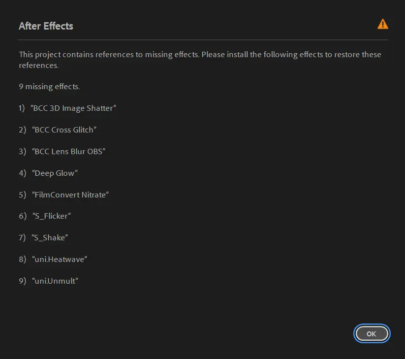 • After Effects will automatically show any missing fonts or effects when you open the project.