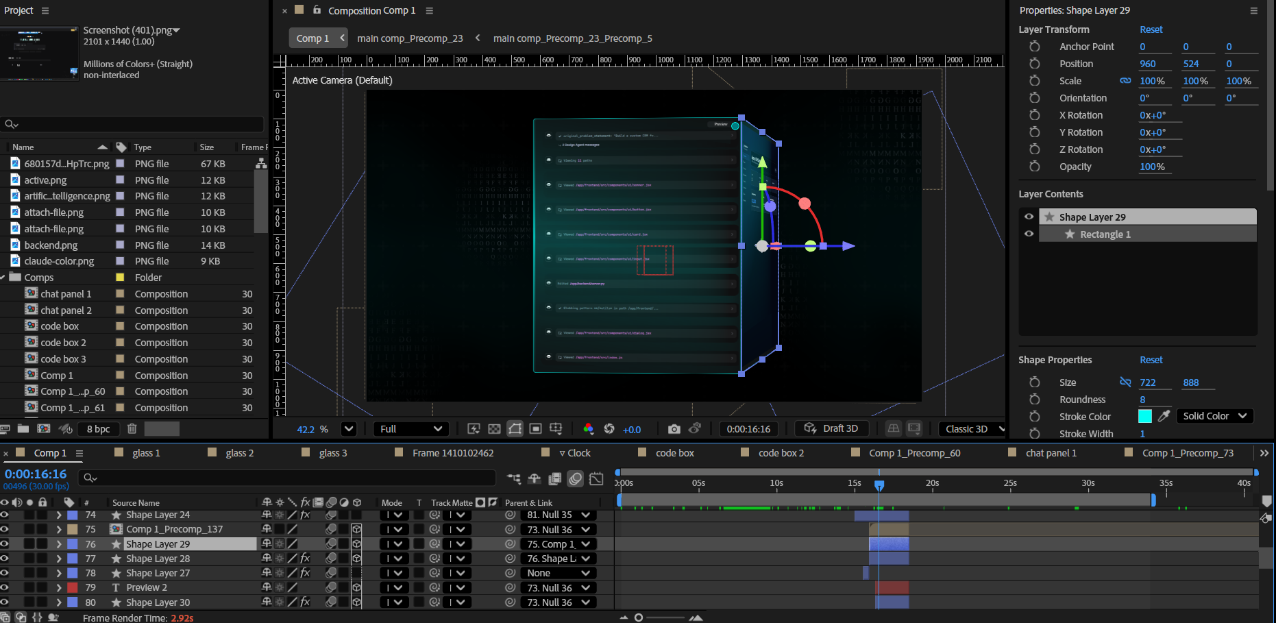 Inside this open .AEP file, editors can study how to build sleek AI product demos using dark UI design, prompt-based storytelling, code-style visuals, and startup motion graphics.