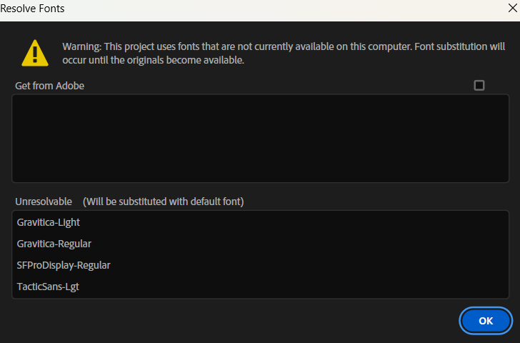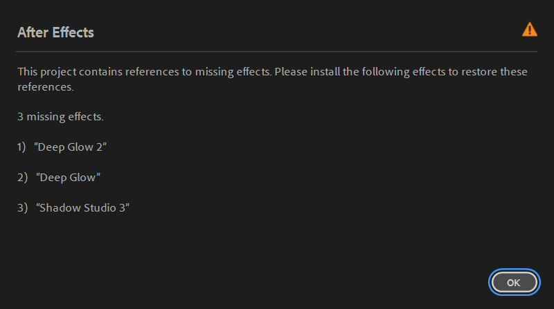 • After Effects will automatically show any missing fonts or effects when you open the project.