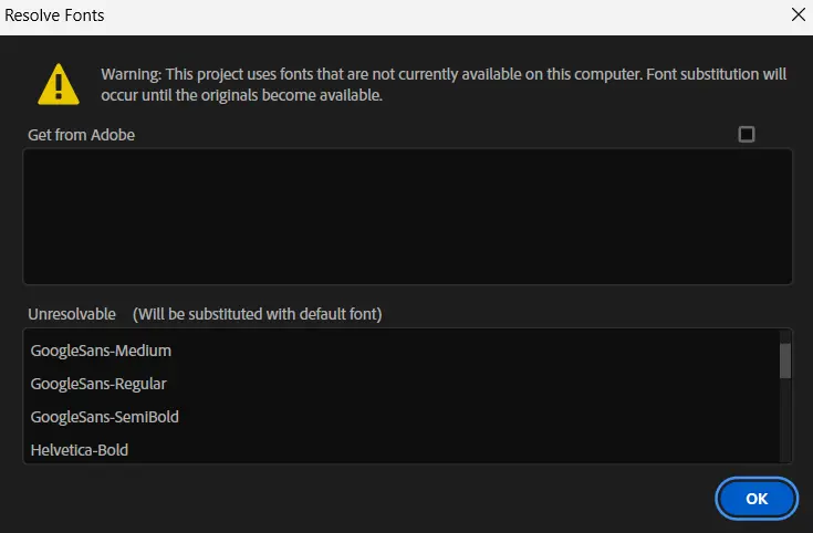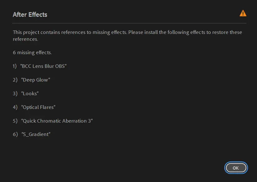 • After Effects will automatically show any missing fonts or effects when you open the project.