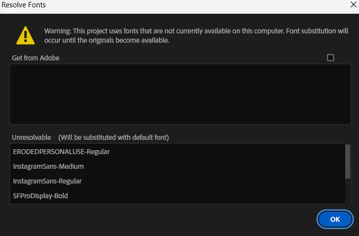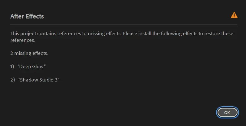 • After Effects will automatically show any missing fonts or effects when you open the project.