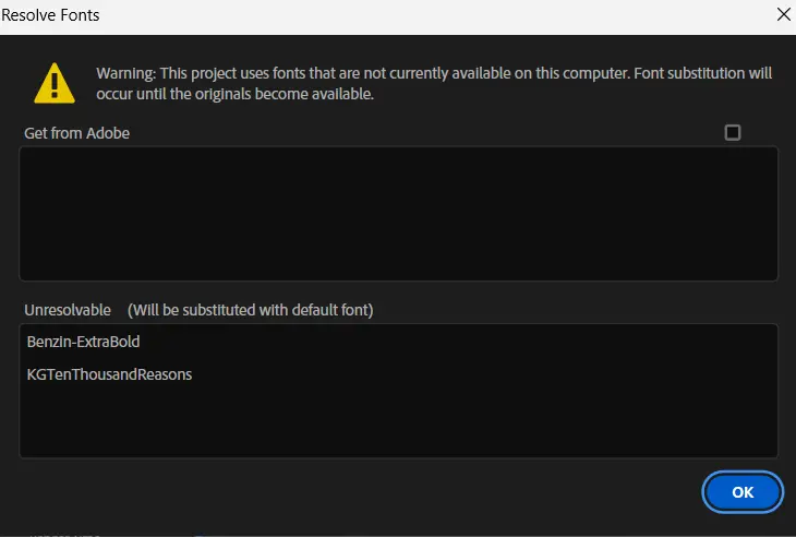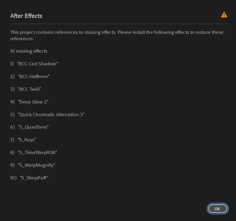 • After Effects will automatically show any missing fonts or effects when you open the project.
