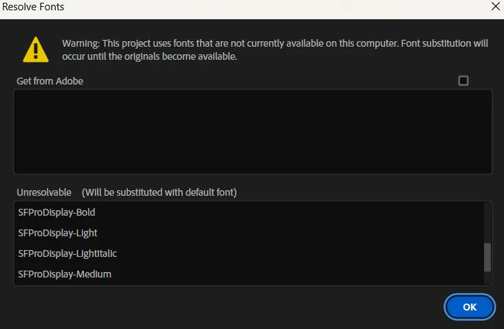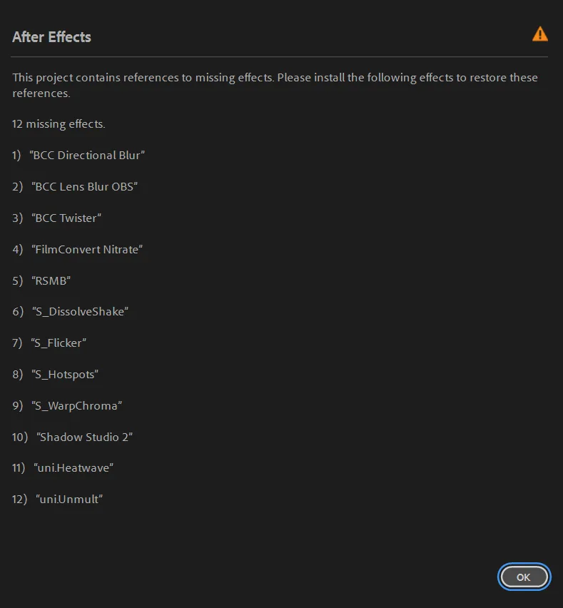 • After Effects will automatically show any missing fonts or effects when you open the project.